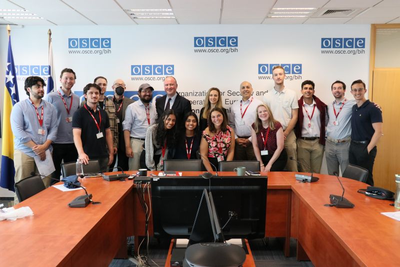 Following their visit to Mostar, students spent several days in Sarajevo continuing their studies of war crimes and visiting the Sarajevo office of the Organization for Security and Cooperation in Europe (OSCE), as well as criminal justice centers and courts. “Visiting the sites of war crimes, sitting in a courtroom where they were and are still being prosecuted, and hearing firsthand accounts of what it was like to live through an international armed conflict really put into perspective the gravity of what we were learning about,” Alexandra Taylor ’26 said.