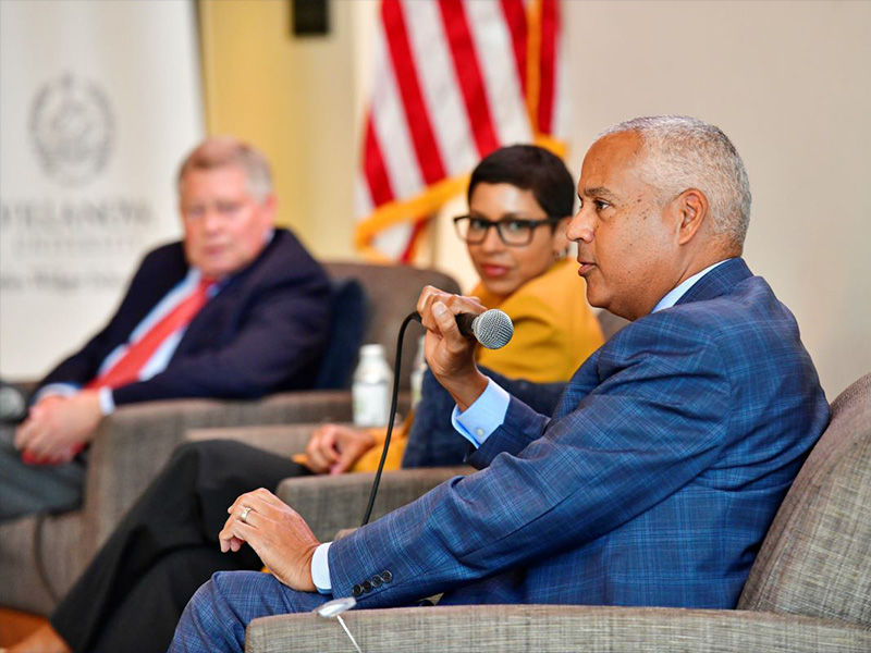 In partnership with the Villanova University College of Liberal Arts and Sciences, Villanova Law hosted a panel discussion in Washington, DC, with former White House Chiefs of Staff Joshua Bolten and Thomas F. “Mack” McLarty III, who discussed how they built bridges to accomplish bipartisan goals during their tenures at the White House.